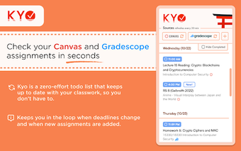 Kyo är en kostnadsfri Chrome-tillägg som integrerar Canvas och Gradescope, vilket gör det möjligt för användare att se sina uppgifter på ett och samma ställe. Denna tjänst syftar till att förenkla hanteringen av läxor och uppgifter genom att eliminera risken för att missa viktiga deadlines. Kyo erbjuder en användarvänlig plattform där studenter kan hålla koll på sina uppgifter och få en översikt över sina akademiska åtaganden.